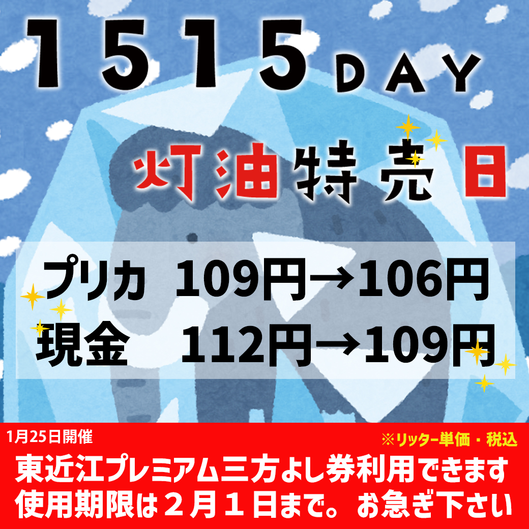 お知らせ カテゴリー すべて プロパンガス 灯油 ECサイト FC店舗 お知らせ 2026.01.24 灯油 灯油店頭特売「1515DAY」開催のお知らせ 1月25日、日曜日開催! さむ~い、寒波!消費した灯油、補充しちゃいましょう。冬はまだまだ続きます! リッターにして、通常の3円お買い得! ご来店お待ちしております。