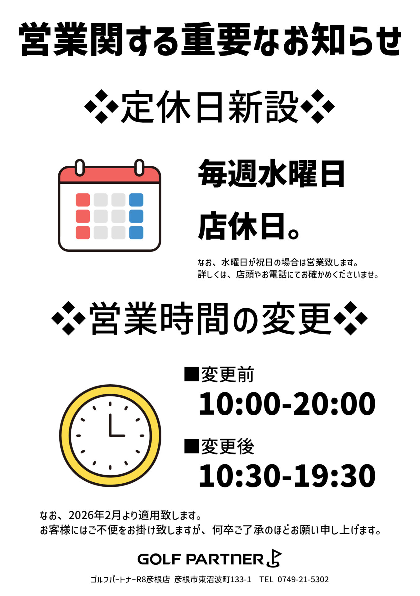 お知らせ カテゴリー すべて プロパンガス 灯油 ECサイト FC店舗 お知らせ 2026.02.03 FC店舗 お知らせ FCゴルフパートナーR8彦根店 定休日新設 いつもゴルフパートナーR8彦根店(彦根市東沼波町133-1)をご愛顧賜りましてありがとうございます。 この度、2月より定休日の新設、営業時間の変更を行いましたのでご報告いたします。 なお、定休日が祝日の場合は営業日とさせていただきます。 以下、チラシをご覧ください。 今後ともゴルフパートナーR8彦根店をよろしくお願い致します。