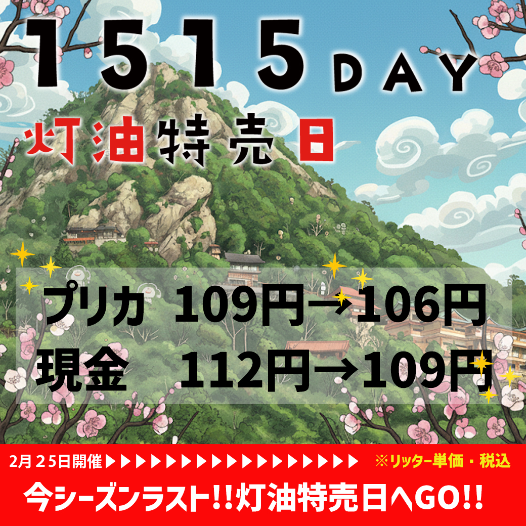 お知らせ カテゴリー すべて プロパンガス 灯油 ECサイト FC店舗 お知らせ 2026.02.24 灯油 お知らせ 【2月25日】今冬ラスト!特売日「1515DAY」開催のお知らせ 特売日もいよいよ今回で終了!今年もありがとうございました!灯油価格も上昇傾向ですので、是非、買いだめをしてください! ご来店、お待ちしております!!スタッフ一同心よりお待ち致しております!