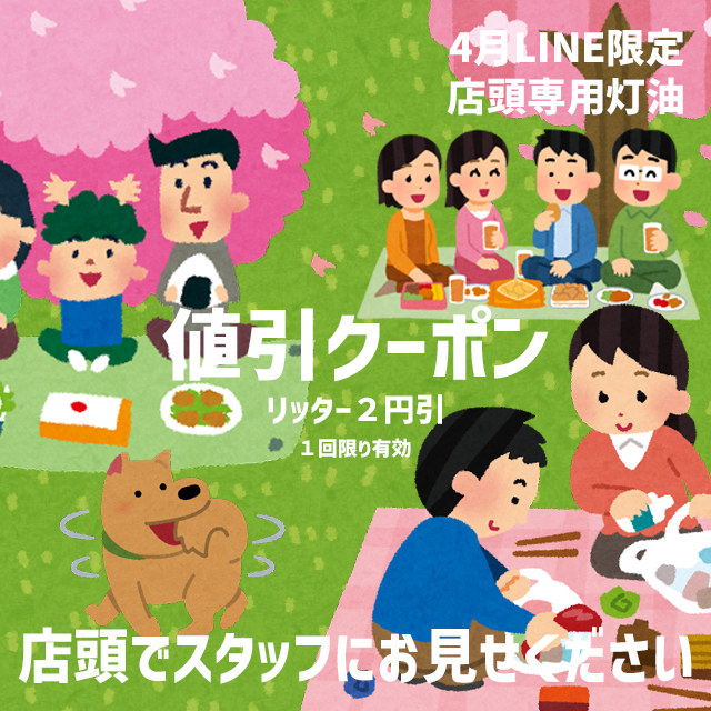 お知らせ カテゴリー すべて プロパンガス 灯油 ECサイト FC店舗 お知らせ 2026.04.06 灯油 お知らせ LINE会員様限定 4月灯油クーポン券(店頭)※配信済みです。 シーズンオフにともない、恒例の月例クーポンを配信いたしました。月に1回限り、店頭価格より「2円引き」となるお得なクーポンになります。 店頭にて、クーポンをご提示いただくことで値引きさせていただきますので、まだLINEお友だちでないお客様はぜひこの機会にご入会下さいませ(登録等一切無料)。 画像をタップ(クリック)するとLINEページに移動します。